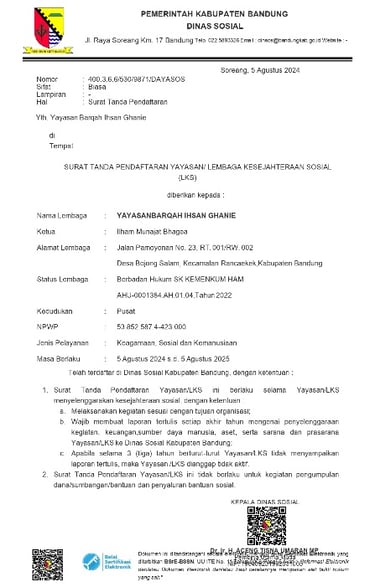 SK Terdaftar sebagai Lembaga Kesejahteraan Sosial No. 400.3.6.6/530/9871/Dayasos